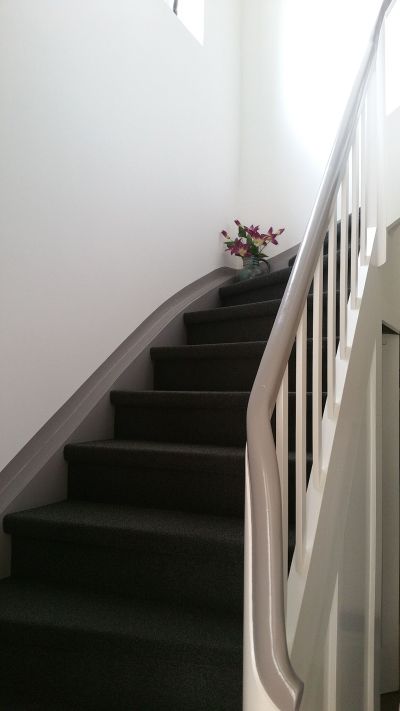 Kleines Treppenhaus renovieren mit neuem Bodenbelag, Lackierarbeiten und neu verpuzten Wänden